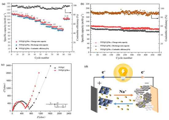 The cycling performances of the NVP@C and NVP@C@Nbx cathodes were initially evaluated under a low current rate of 0.5C during 100 cycles (Figure 7c). The NVP@C cathode exhibited a lower reversible capacity of 72.5 mAhg−1 after 100 cycles. However, the NVP@C@Nb0.15 cathodes showed excellent reversible capacity, with a discharge capacity of 104.7 mAhg−1 after 100 cycles and a cycling retention of 91.62%. After 500 cycles, the discharge capacity was still 94.5 mAhg−1 with a capacity loss rate of only 16.3% (Figure 8b), indicating good long-term stability. Ge’s team [43] had synthesized the carbon-coated monoclinic NaVPO4F cathode of SIBs, which reversible capacity was 111 mA hg−1 at 0.1C for 1000 cycles at 10C, maintaining 81.8% capacity and 68 mAhg−1 at 20C. These showed that the doped heteroatoms could improve the performance of NVP@C.