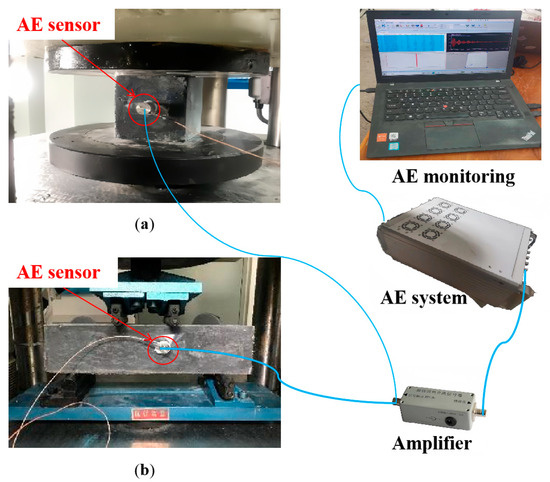 Mechanical and AE test system diagram: (a) compressive test and (b) four-point bending test.