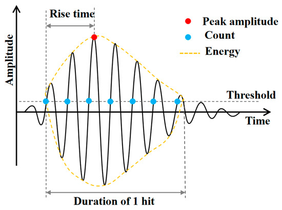 In this study, AE parameters such as ringing count, energy, information entropy, b-value and RA-AF were used to compare the fracture characteristics of UHPMC under different material conditions. Typical AE signals and key parameters are shown in Figure 5 [36].