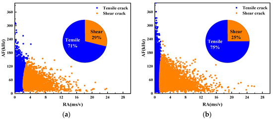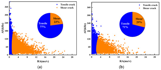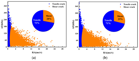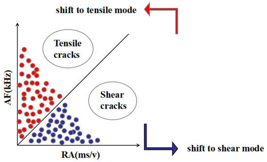 RA is the ratio of rise time to amplitude in AE events, and AF is the ratio of counts to duration in AE events. In the traditional method, the RA-AF dividing line is used to distinguish between tensile failure mode and shear failure mode, as shown in Figure 6. However, it is impossible to determine the exact boundary. The Gaussian mixture model (GMM) is verified to be the most suitable algorithm for the classification of acoustic emission cracks [43,44]. Therefore, GMM was used for crack classification in this paper.