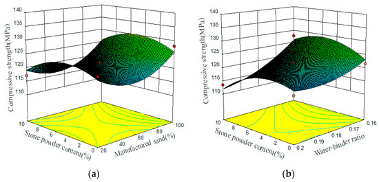 Three-dimensional response surface plots between preparation parameters and compressive strength: (a) stone powder content and MS replacement ratio; (b) water–binder ratio and stone powder content (The red points represent design points where the actual values are higher or lower than the predicted values).