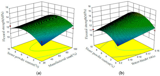 Three-dimensional response surface plots between preparation parameters and flexural strength: (a) stone powder content and MS replacement ratio; (b) water–binder ratio and stone powder content (The red points represent design points where the actual values are higher or lower than the predicted values).