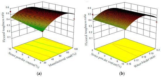 Three-dimensional response surface plots between preparation parameters and flexural toughness ratio: (a) stone powder content and MS replacement ratio; (b) water–binder ratio and stone powder content (The red points represent design points where the actual values are higher or lower than the predicted values; The differently colored curves at the bottom are projection graphs of the three-dimensional surface, reflecting the same meaning as the three-dimensional surface itself).