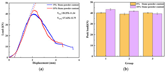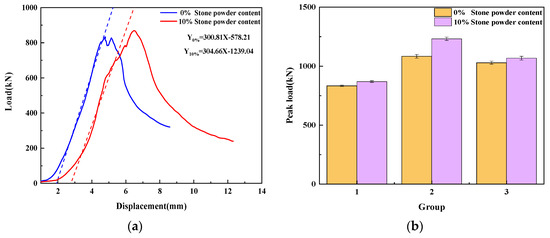 The UHPMC load–displacement curves with a 0% and 10% stone powder content are shown in Figure 12a. The peak load of the three sets of 0% and 10% stone powder content specimens is shown in Figure 12b. As can be observed, the compressive strength of the specimen with a 10% stone powder content is marginally higher than that of the specimen with a 0% stone powder content when the water–binder ratio and MS replacement ratio are both equal. The 10% stone powder content specimen has a greater displacement in the elastic stage, indicating that its deformation is large in the elastic stage and its resistance is weak. It can be observed that there is not much of a difference between the slopes of the curves for the specimens with 0% and 10% stone powder contents (300.81 and 304.66, respectively) by fitting the tangent of the elastic stage of the load–displacement curve.