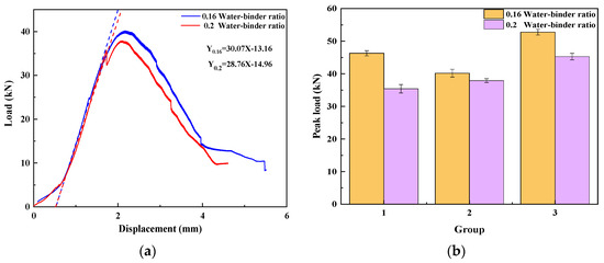 Water–binder ratio: (a) load–displacement curve; (b) peak load in compression (The dashed line represents the slope of the load-displacement curve in the elastic stage).