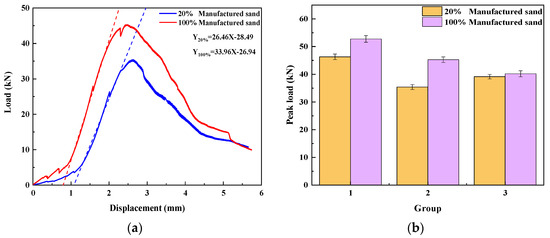 The UHPMC load–displacement curves with a 20% and 100% MS replacement ratio are shown in Figure 11a. The peak load of the three sets of 20% and 100% MS replacement ratio specimens is shown in Figure 11b. When the water–binder ratio and stone powder content are controlled to be the same, an increase in MS replacement ratio can improve the compressive strength of UHPMC. It can be seen that the 20% MS group experiences larger displacement during the elastic stage, indicating that the cracks and deformation displayed by the 20% MS replacement ratio group are greater than those displayed by the 100% MS replacement ratio group during the elastic stage. By fitting the tangent of the elastic stage, it can be seen that the slope of the 100% MS replacement ratio group (810.48) is steeper than the slope of the 20% MS replacement ratio group (380.70).