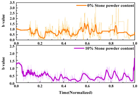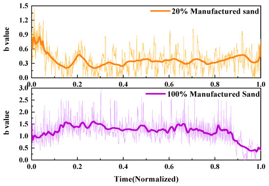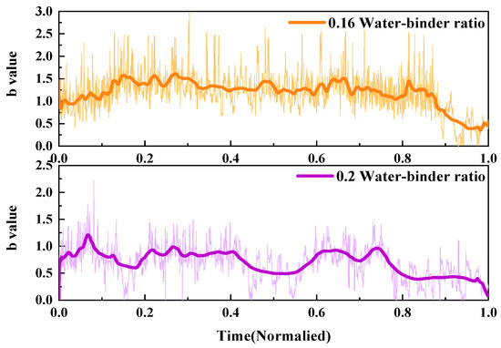 The b-value is an indicator of incipient damage. A stable b-value indicates that the concrete is mainly in a micro-cracked state, while a decrease in the b-value indicates the development of micro-cracks in concrete. The formula for the b-value is represented by Equation (4) [40,41].