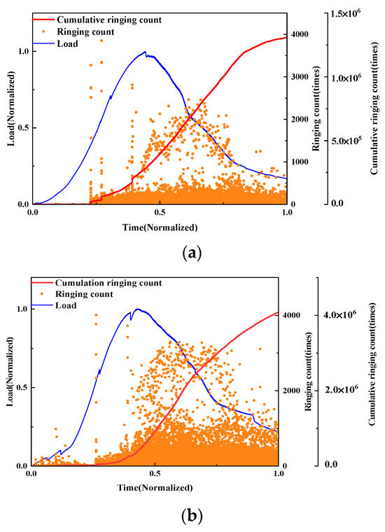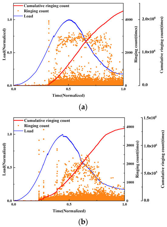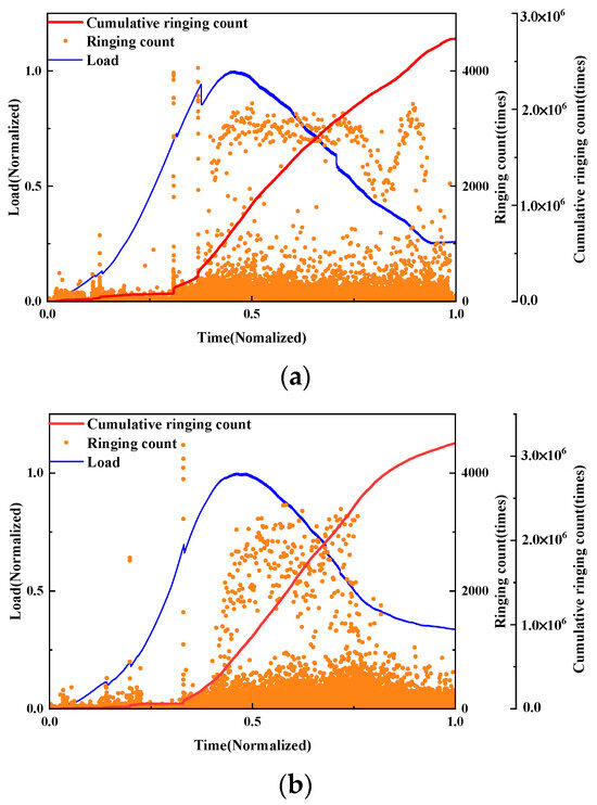 Curves of the load and AE ringing count of UHPMC with different stone powder contents: (a) 0% stone powder content; (b) 10% stone powder content.