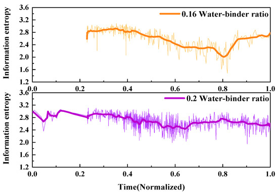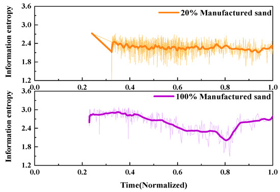 The fracture process of UHPMC specimens with different MS replacement ratio was characterized and compared using AE information entropy. The comparison of the information entropy curves of the M20-S5-W0.16 and M100-S5-W0.16 beams with MS replacement ratio of 20% and 100% is shown in Figure 26.