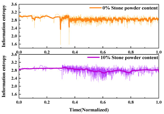 The fracture process of UHPMC specimens with different stone powder contents was characterized and compared using AE information entropy. Figure 29 presents the comparison of information entropy curves for the beams M60-S0-W0.2 and M60-S10-W0.2, representing 0% and 10% stone powder content, respectively.