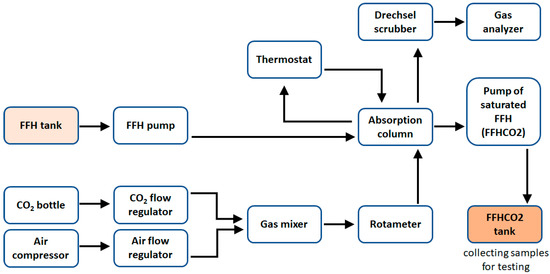 Nanoparticle ferriferous hydrosol (FFH) is an aqueous solution of iron II hydroxide. The content of total iron in FFH is 30 g/L. The content of iron Fe (II) in this sorbent is 24 g/L and the content of iron chloride is 4 g/L. The pH of FFH is pH 8.0. The research used waste iron sorbent (FFHCO2) generated after carbon dioxide capture in a laboratory installation. The installation consisted of a gas preparation module, an absorption column, a gas analyzer and a thermostat maintaining the set process temperature. Gas with a given CO2 concentration was prepared by mixing pure carbon dioxide (from a gas cylinder) with air (air compressor). A proper gas ratio and flow were achieved by using electronic flow regulators. Gas streams were mixed in a gas mixer. The mixer was a 500 mL glass container with an inert glass filling (Raschig rings). The role of the absorber was played by glass columns with an internal diameter of 42 mm and a total length of 1000 mm, equipped with a sieve bottom (located on the narrowing) on which a glass filling in the form of Raschig rings was placed. Saturated FFH (FFHCO2) was collected using a pump in a tank from which samples were taken for testing (Figure 2).