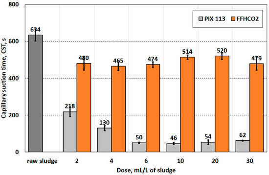 Comparison of capillary suction time of sludge conditioned with coagulant PIX 113 waste sorbent FFHCO2.