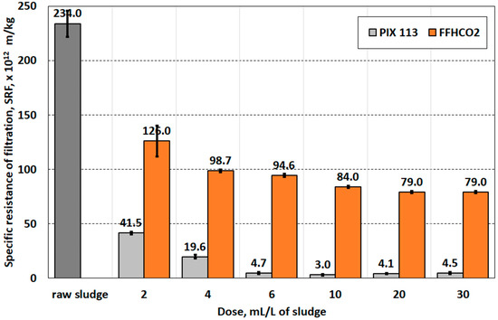 Values of the specific resistance of filtration indicated that the use of FFHCO2 can improve the filtration capacity of sludge (Figure 6). However, the filtration resistance of sludge conditioned with FFHCO2 was significantly higher than 5.0 × 1012 m/kg, which is the threshold value for considering the sludge is susceptible to mechanical separation [32]. The PIX 113 dosage of 6.0 mL/L sludge already ensured effective dewatering of the conditioned sludge.