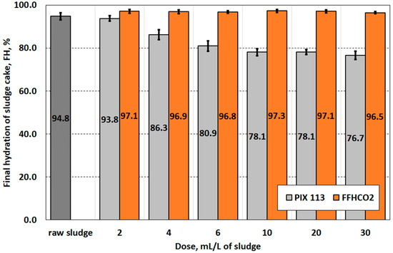 The negative assessment of FFHCO2 as a sludge-conditioning agent prior to dewatering is confirmed by the results of filter cake hydration after sludge filtration (Figure 7). While the dosage of PIX 113 causes a gradual decrease in cake hydration, the dosage of FFHCO2 does not cause any significant changes. It is worth mentioning that filtration of raw sludge without conditioning allowed sludge dewatering to a level of 94.8%. Regardless of the dose of FFHCO2 used, hydration of the filter cake is around 97%. Xu et al. [40] and Zhang et al. [34] state that an effective conditioning agent must be able to reduce sludge hydration to below 80%. This condition was only met by using PIX 113 at a dose ≥10.0 g/L.