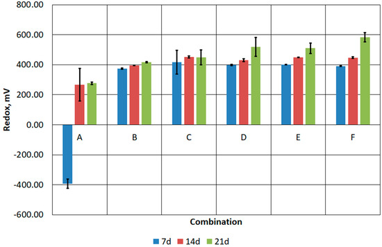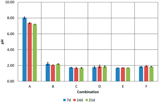 Pre-acidification allowed a low pH to be maintained in samples B-F throughout the duration of the experiment (Figure 8). A low pH, i.e., 2.0, is optimal for the development of bioleaching bacteria. Low pH affects the activity of microorganisms responsible for the degradation of organic contaminants and the solubility and mobility of metals in the environment [44,45]. Suitable conditions for the growth of A. thiooxidans and A. ferrooxidans were also confirmed by values of the oxidation–reduction potential [46,47] (Figure 9). The lowest redox value for the B–F combinations was about 400 mV and was recorded on the seventh day of the process. In each of the following 7 days of the process, the redox potential increased, even to values above 500 mV, which was observed in combinations D, E and F.