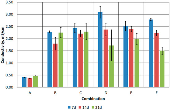 During bioleaching, chemical and biochemical processes can affect the chemical composition of the solution, which can lead to changes in its conductivity. If an effective bioleaching process results in the release of metal ions from waste into the solution, an increase in conductivity can be expected due to the presence of these ions in the solution [48,49]. In the tested samples, higher conductivity was recorded in the samples subjected to acidification (Figure 10). In the case of combination A, the electrical conductivity did not exceed 0.5 mS/cm. In the case of combinations B–F, it ranged from 1.5 mS/cm to about 3.0 mS/cm. In addition, the general pattern for combinations B–F was a decrease in electrical conductivity with process time. However, the obtained conductance values were considered low, especially since the typical conductance value for sea water is 50 mS/cm [50].