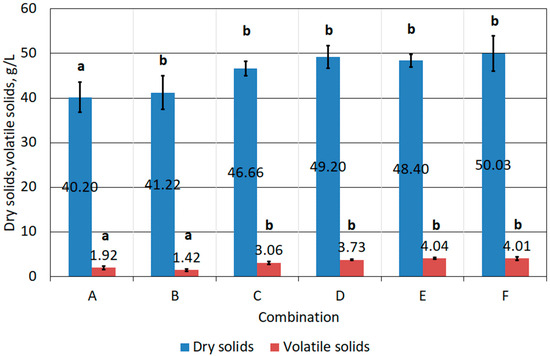 The 21-day bioleaching process did not result in a significant increase in dry solids and volatile solids in the tested samples (Figure 11). In combinations B–F, there was some increase in the dry solids of the samples, mainly due to dosing of the reagents. However, mathematical analysis showed that in combinations B–F (group b) changes in mass concentration were not statistically significant. An increase in volatile solids—organic matter—that could indicate an increase in biomass was observed in combinations C–F. It is concluded that only inoculated FFHCO2 samples, together with the addition of energy substrates (C–F), can potentially provide a suitable substrate for the growth of bioleaching bacteria. It should be noted that volatile solids (including biomass) represented a maximum of 8% of the dry solids of the samples (8% DS.). For comparison, the treatment of landfill leachate by bioleaching allowed a biomass yield of approximately 60% DS. (22 g/L) [51]. When water treatment sludge was used as a growth medium for bioleaching bacteria, the concentration of volatile solids—biomass—was approximately 46 g/L, which represented almost 80% of the dry mass of the sample [52].