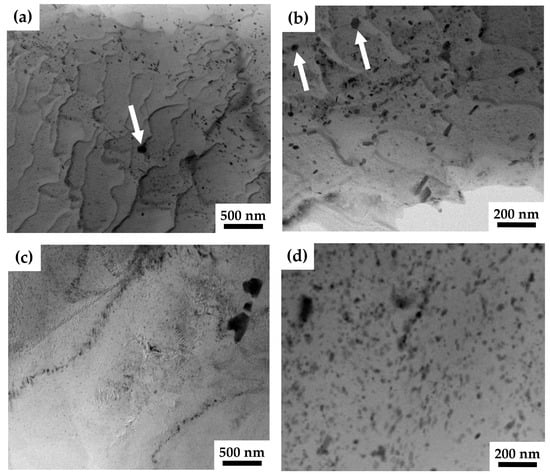Bright-field (a–c) and HAADF (d) TEM images from the longitudinal section of the ZK60-ex (a,b) and ZK60-150 (c,d) samples. Globular particles are shown by white arrows.