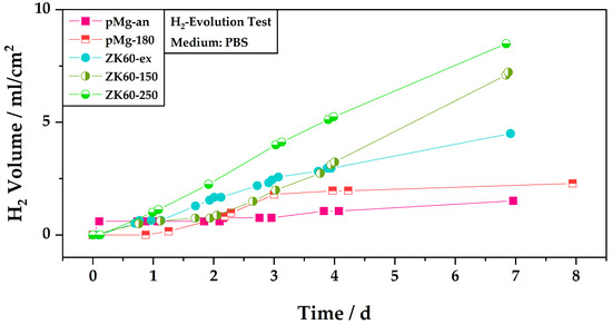 At the beginning of the test, the levels of hydrogen evolution for sample ZK60-150 and sample pMg-180 are also comparable, which changes only after three days. Sample ZK60-150 shows a slower increase of hydrogen volume in the first two days as compared to the remaining test time, where the slope of the hydrogen evolution increases. Up to day four of the test, sample ZK60-150 also shows lower hydrogen volumes, and thus lower corrosion activity, than sample ZK60-ex. For ZK60-ex an inverse trend for the the hydrogen evolution compared to that of ZK60-150 can be observed. Here, the increase in hydrogen volume is quicker in the first three days before slowing down for the remainder of the test. The test for sample ZK60-250 shows higher hydrogen volumes as compared to all other samples almost from the beginning. Only the sample pMg-an with its steep slope in the beginning surpasses the levels for sample ZK60-250 in the first day.