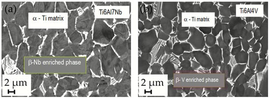 (a) SEM/BE image of Ti6Al7Nb alloy microstructure (A283). It consists of two phases (α + β). α-phase (dark) represents the matrix, which has a close-packed hexagonal crystal structure (hcp), and the β-Nb-enriched β phase (white) in the body-centered cubic structure. (b) SEM/BE image of Ti6Al4V alloy microstructure of new Lima stem. α phase (dark) represents the matrix and the β-V-enriched phase (white) at M2500.