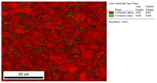 The quantitative determination of phase distributions in the new sample Ti6Al7Nb alloy is possible by using the electron backscattered diffraction integrated technique on the field emission scanning electron microscope, EBSD, where the stem taper microstructure is (α + β), as in Figure 5. The EBSD method is compatible with the XRD method but on a smaller scale and for that reason is mounted on the FE-SEM. The EBSD method is very precise; the limitation of EBSD, besides being a very accurate, precise method, is that it is very time-consuming, and for that reason is suitable for basic research and the development of new biomaterial alloys.
