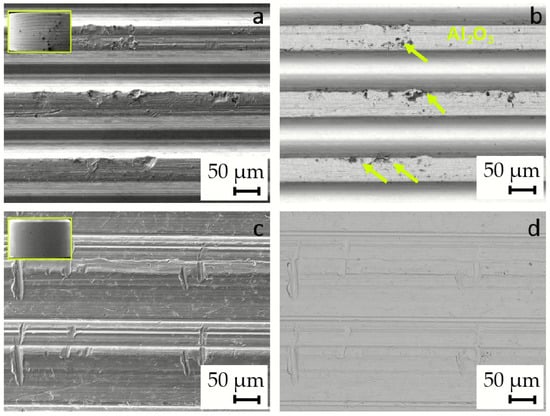 Images of the surface of the new, unused tapers. (a) SE image of Alloclassic new; (b) BE image of Alloclassic new; the remains of grit blasting are observed, dark particles, marked with yellow arrows; (c) SE image of Lima Corporate new; and (d) BE image of Lima Corporate new.