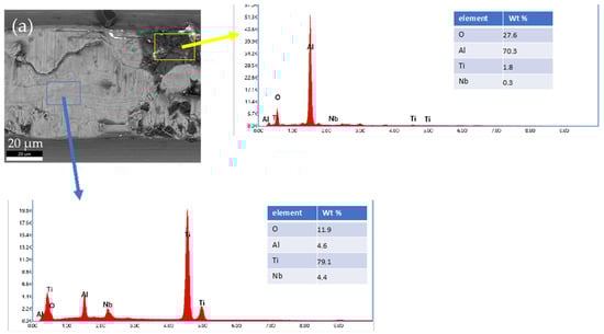EDS analysis of a selected area of new Alloclassic taper. (a) BE image of the area. Yellow box indicates the remnants of Al2O3 (corundum) of micro-threaded blaster finishing, and blue box shows the matrix Ti6Al7Nb alloy.