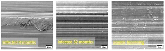 The retrieved stems were manufactured by SL-Plus, Smith & Nephew (London, UK), and Endoplus (London, UK). After revision surgery, the implants were sent for sonication and microbiological analysis in Ringer’s solution, followed by cleaning and sterilization [,,,].