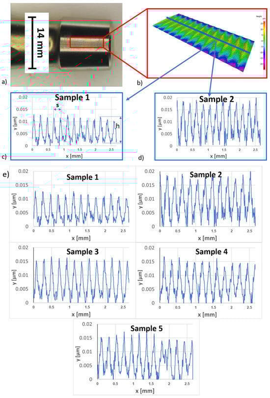 The micro-threaded surface roughness of stem tapers was measured using an optical profilometer made by Alicona Infinite Focus G4 (Raaba-Grambach, Austria) using focus variation method of measurement. A 2 × 1 field of view resulting in an area of 2681 × 1088 mm was captured using a 10× zoom lens. From the obtained 3D profile, the 2D roughness parameters were calculated in the longitudinal direction in accordance with the ISO 4287 standard []. The standard roughness parameters Ra—average surface roughness and Rz—mean peak to valley height of roughness profile were utilized for this investigation. Additionally, profile depth and peak spacing for different samples were examined, with an evaluation length of 2.67 mm for all samples.