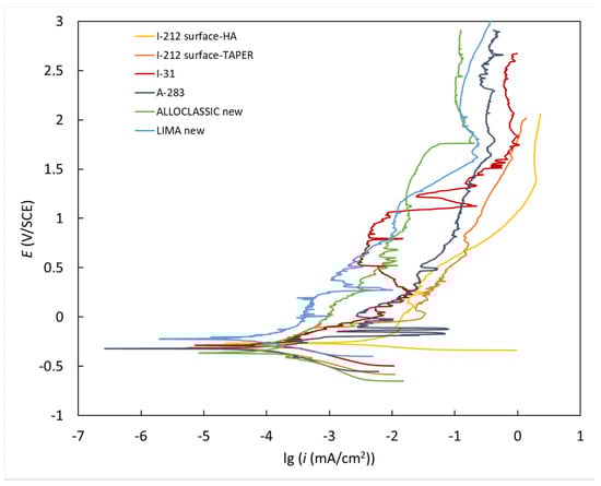 Potentiodynamic curves for the investigated new and retrieved samples were measured in simulated physiological Hank’s solution at pH = 7.8 and 37 °C.