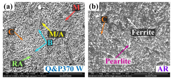 Microstructural morphology of (a) Q&P370 W and (b) AR; AR: as-received specimen, B: bainite, C: carbide precipitate, M: martensite, M/A: martensite/austenite (M/A) islands, RA: retained austenite, W: water.
