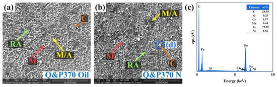Microstructural morphology of (a) Q&P370 Oil, (b) Q&P370 N, and (c) elementary analysis of area d in (b), C: carbide precipitate, M: martensite, M/A: martensite/austenite (M/A) islands, N: normalizing, RA: retained austenite.