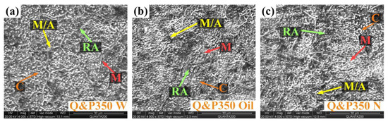 Microstructural morphology of (a) Q&P350 W, (b) Q&P350 Oil, and (c) Q&P350 N, C: carbide precipitate, M: martensite, M/A: martensite/austenite (M/A) islands, N: normalizing, RA: retained austenite, W: water.