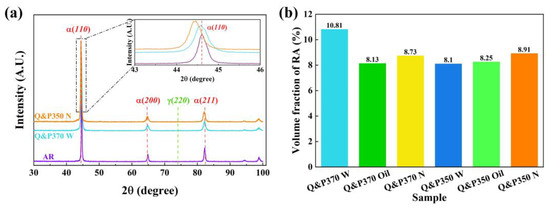 where is the peak intensity of α(211) and represents the peak intensity of γ(220). Q&P370 W has the highest volume of RA at 10.81%, in which the induction of bainite promotes the transformation of filmy RA with high stability and a limited amount of blocky RA with fewer carbide precipitates located around bainite. Q&P370 Oil has the lowest RA volume of 8.13%. Also, less RA is observed in Figure 4a, proving that coarse M/A islands constitute the main component of the specimen. The RA volume of Q&P370 N increased to 8.73% with blocky RA with high carbon content and high stability. The smaller sizes of RA, M/A islands, and martensite in Figure 4b could be explained by the fact that the full dissolution of carbon refines the size of blocky RA and splits M/A islands and martensite into smaller sizes [39]. For specimens treated by the Q&P350 process, the RA volume exhibits a limited difference among different quenching methods and is much lower than it is in Q&P370 W. The RA volumes of Q&P350 W, Oil, and N are 8.1%, 8.25%, and 8.91%, respectively. This result proves that carbon redistribution during the Q&P350 process is mild, and the absence of bainite reduces the stability of RA. The adequate redistribution of carbon induces blocky RA, and a lower cooling speed promotes a higher RA volume.