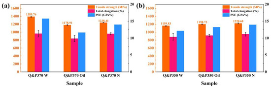 Figure 7 exhibits the results of tensile strength, total elongation, and PSE of specimens treated by Q&P370 and 350 in different cooling methods. In Figure 7a, Q&P370 W has the highest tensile strength of 1389.76 MPa and a total elongation of 11.34%. This is followed by Q&P370 N in 1238.41 MPa and 11.3%. Q&P370 Oil has the worst mechanical properties of 1178.91 MPa and 9.88%. For Q&P370, PSE has the same tendency as total elongation with 15.76 GPa%, 11.65 GPa %, and 13.99 GPa% for W, Oil, and N, respectively. It is demonstrated that stable filmy RA together with the refined component size in Q&P370 W exhibits superior mechanical properties. As analyzed above, the TRIP effect is determined by the type, size, volume, and stability of RA, which is vital to the mechanical properties of steel. Hence, steel treated by the Q&P370 W process contains a high volume of filmy RA and exhibits a combination of strength and plasticity as superior mechanical properties compared to oil and normalizing. Q&P370 N has a rich content of small blocky RA with high stability and refined M/A islands and martensite. The smaller component size with good plasticity in Q&P370 N retards crack propagation, and the total elongation is close to that of Q&P370 W, but the specimen with no filmy RA shows a noticeable decrease in tensile strength [40]. Q&P370 Oil performs the worst in tensile strength due to the coarse component size and low stability of blocky RA; also, the high content of brittle M/A islands and martensite leads to poor total elongation.