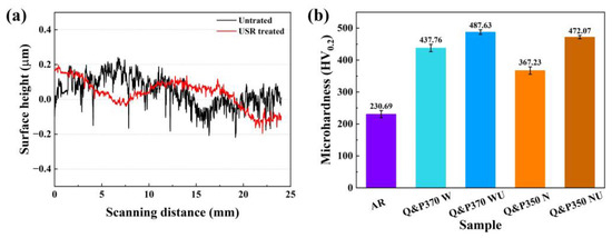 (a) Surface profile of AR, Q&P370 WU, and Q&P350 NU, and (b) surface hardness comparison of Q&P and USR processes; U: USR-treated.