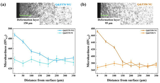 Gradient hardness was measured to explore the hardness distribution and depth of the hardened layers of Q&P370 WU and Q&P350 NU, as shown in Figure 9. Q&P370 WU has a deeper deformation layer than Q&P350 NU because for Q&P370 WU, a high content of filmy RA promotes superior plasticity. In Figure 9a, the grain size near the surface was significantly reduced due to severe plastic deformation. Also, a deep hardened layer with a slowly decreasing hardness gradient distribution was induced after the USR process. Bainite in Q&P370 W splits blocky RA, martensite, and M/A islands into smaller sizes, which guarantees the high hardness of steel. After the USR process, grain size refinement on the surface leads to an increase in surface hardness, and the structural properties of a hard surface and high plasticity in the core promote the mechanical properties of the combination of strength and plasticity. In comparison, the depth of the hardened layer in Q&P350 NU is shallow with a dramatically reduced hardness gradient. For Q&P350 N, blocky RA and martensite are the main components of the specimen, which induces hard and brittle characteristics. In Figure 9b, the grain size near the surface is smashed into smaller sizes, which enhances the surface hardness compared to before the USR process. However, the depth of the hardened layer is impeded by blocky RA and martensite, and the deformation layer is shallow. As a result, the USR process causes a more hardened surface with a limited depth of the hardened layer, and the hardness gradient is significantly reduced. In addition, the microstructure of Q&P350 NU below the hardened layer is still hard and brittle with coarse blocky RA and martensite, and the mechanical properties of Q&P350 NU are much more brittle. The results prove that the USR process has a superior effect on steel with high plasticity, and the combination of strength and plasticity can be achieved using surface strengthening [43].