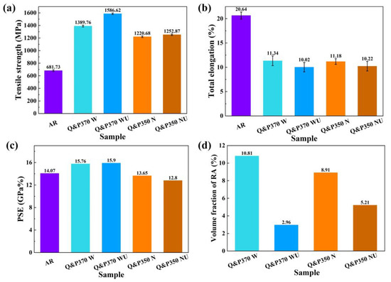 The tensile test results of specimens treated by a combined process of Q&P and the USR are compared with Q&P-treated specimens and AR specimens and the results are listed in Figure 11 as the tensile strength, total elongation, PSE, and volume fraction of RA. In Figure 11a, Q&P370 WU has the highest tensile strength of 1586.62 MPa and showed an increase of 14.17% compared to Q&P370 W in 1389.76 MPa, while the tensile strength of AR is 681.73 MPa. The Q&P process significantly improves the strength of steel, and the USR process induces a further enhancement in strength with a deep hardened layer. In comparison, the tensile strength of Q&P350 N is 1220.68 MPa, and it improved to a limited extension of 1252.87 MPa after the USR process due to the low plasticity of Q&P350 NU. A more pronounced strength increase could be obtained by the USR process when steel has better plasticity, and the combination of strength and plasticity could be achieved. In comparison, the limited strength increase in Q&P350 N demonstrates that a hard and brittle surface hinders the formation of a hardened layer in the USR process, thus having a negative influence on strength improvement. The tensile strength of the AR specimen also illustrates that steel with a rough component size is poor in tensile strength, thus showing the effect of mechanical performance enhancement by the combined process of Q&P and USR process.