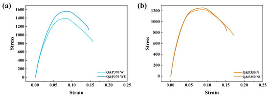 Strain–stress curve of (a) Q&P370 W, WU and (b) Q&P350 N, NU.