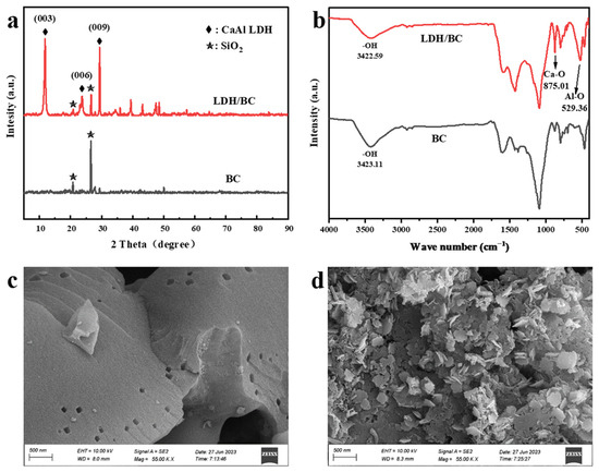 XRD spectra (a) and FTIR spectra (b) of CaAl-LDH/BC and BC; SEM of BC (c) and CaAl-LDH/BC (d). (LDH/BC in the figure implies CaAl-LDH/BC).