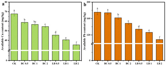 Effect of BC and CaAl-LDH/BC on Cu (a) and Pb (b) effective state concentrations. (The a, b, c, d, e, and f near the error bars represent significant differences according to the Student’s t-test [p < 0.5]).