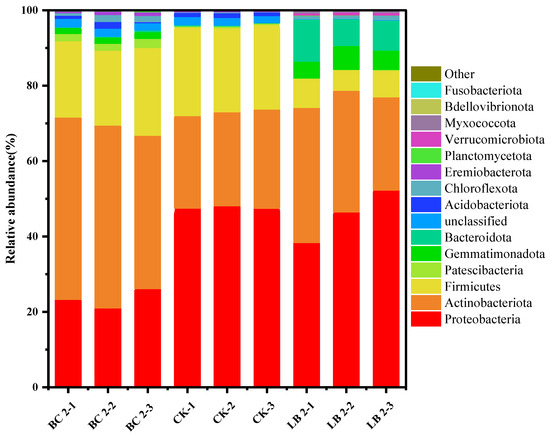 To assess the species diversity of the total soil microbial community, the microbiota Chao1 index, Shannon index, and Coverage indices were analyzed. As shown in Table 3, the Coverage of the CK, BC 2, and LB 2 groups exceeded 0.999, which indicates that the microbial sequencing results of the samples are very reliable. The Chao1 index and Shannon index values after treatment with a 2% dosage of BC or CaAl-LDH/BC showed an increase. The average Chao1 index and average Shannon index values of the microbial community in the BC treatment group increased from 417.94 and 5.09 in the CK group to 562.20 and 6.19, which indicated that the addition of biochar was beneficial to the increase in microbial community diversity and richness in the soil, which is consistent with [39] and the fact that the herbaceous biochar can increase soil porosity due to its highly porous nature and play a role in protecting microorganisms, thus promoting the growth and diversity of microbial biomass. The average Chao1 index and average Shannon index values of the CaAl-LDH/BC treatment group reached 811.56 and 6.45, and the Chao1 index in particular was much higher than that of the CK group (417.94) and that of the BC treatment group (562.20). This phenomenon may be attributed to the fact that the CaAl-LDH/BC can reduce the available content of heavy metals (Table 1) and increase the APC and AKC in the soil (Table 1) more efficiently than BC, thus providing better environmental conditions for the diversity of soil microbial communities and significantly contributing to the growth of species number and the equalization of species distribution. This is consistent with Huang et al.’s finding that the increase in nutrients such as nitrogen, phosphorus, and potassium in the soil was favorable to the increase in species diversity of soil microbial communities [40].