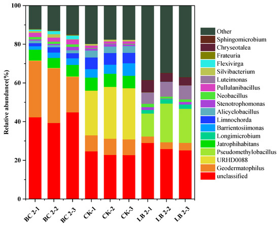 As can be seen in Figure 4, the soil microorganisms in each group of BC2, CK, and LB2, at the genus level, differed greatly in composition, indicating that both BC and CaAl-LDH/BC significantly altered the composition of the microbial community in the soil at the genus level. The average relative abundance of Geodermatophilus increased from 8.27% to 25.24% in the CK group in the soil remediated with 2% BC. Some studies have reported that Geodermatophilus can be found in the rhizosphere of nickel-hyperaccumulating plants [45], which may favor the enrichment of heavy metals in soil by plants. Pseudomethylobacillus, Luteimonas, Chryseotalea, and Longimicrobium appeared as the dominant genera at the gate level in the soil remediated with a 2% dosage of LDH/BC, where Pseudomethylobacillus and Chryseotalea increased the average relative abundance from 0.0038% and 0% to 16.47% and 6.8%, respectively, and it has been reported that both of them are found in freshwater water and their occurrence in the soil may imply the improvement in the soil environment [46,47]. Based on previous reports [48], Luteimonas is one of the core genera in composting that promotes the process of nitrogen transformation and thus reduces nitrogen loss, indicating that an increase in the average relative abundance of Luteimonas from 0.0004% to 6.80% is beneficial for improving the nitrogen fixation capacity of the soil. The average relative abundance of Longimicrobium increased from 0% to 2.14%, and available studies have shown that Longimicrobium can promote plant tolerance to heavy metal and salt stress, nutrient uptake, and plant growth [49].