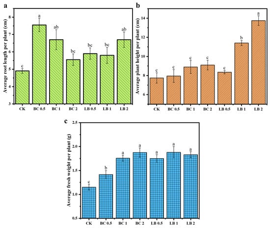 Average root length (a), average plant height (b), and average fresh weight (c) of pea seedlings in blank and treated soils. (The a, b, and c near the error bars represent significant differences according to the Student’s t-test [p < 0.5]).