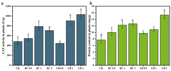 The results of CAT activity in pea seedlings are shown in Figure 6a. The CAT activity in pea seedlings of the CK group was 481.65 U/mg, and that in pea seedlings of the BC group ranged from 545.87 to 788.99 U/mg, with the highest activity in the BC 1 group (BC dosage of 1%), which was 788.99 U/mg. The CAT activity in pea seedlings of the LB group ranged from 444.95 to 1032.11 U/mg, with the highest activity of 1032.11 U/mg in the LB 2 group, and the CAT activity tended to increase with the dosage of CaAl-LDH/BC. It indicated that compared to BC, CaAl-LDH/BC could increase CAT activity in pea seedlings more effectively and mitigate the toxic effects of heavy metals on pea seedlings. As shown in Figure 6b, the protein content of pea seedlings in the control group (CK) was 7.71 mg/g, and the protein content of pea seedlings in the BC group ranged from 10.00 to 12.64 mg/g, with the highest protein content being 12.64 mg/g in the BC 2 group. The protein content of pea seedlings in the LB group ranged from 9.72 to 15.31 mg/g, with the LB 2 group having the highest at 15.31 mg/g, and these data indicated a positive correlation between protein content and the addition of CaAl-LDH/BC. It indicated that CaAl-LDH/BC increased the biosynthesis capacity of plants, which may be related to the ability of CaAl-LDH/BC complexes to improve the fertility nutrients of the soil.