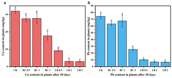 To further investigate the effects of BC and CaAl-LDH/BC on the remediation of contaminated soil in the mining area and the Cu and Pb contents in plants, the Cu and Pb contents in pea seedlings incubated for 30 days were examined in this paper.