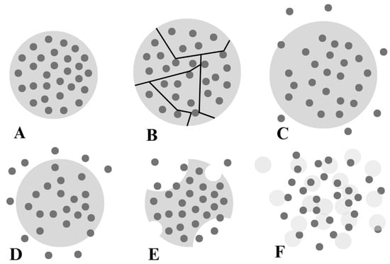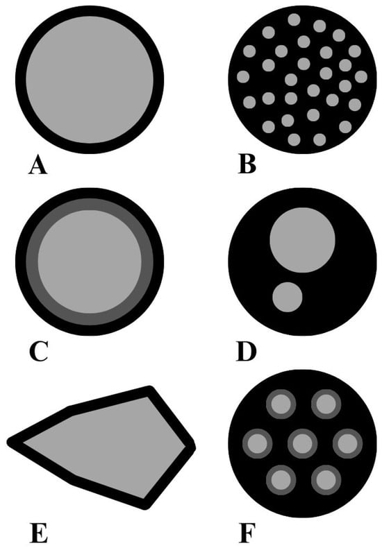 Different types of microcapsule architectures: (A) simple microcapsule, (B) microsphere, (C) multiwall microcapsule, (D) multicore microcapsule, (E) irregular microcapsule, (F) assembly of microcapsules, polymer layer are represented in black and dark grey and the light grey represents the active substance, inspired by [20].