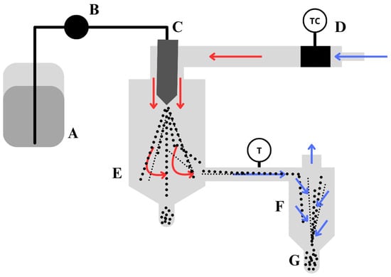 Scheme of the spray-drying process for encapsulation of active ingredients, (A) tank containing the sprayed mixture: polymer and active ingredient, (B) pump to feed the mixture in the system, (C) spray nozzle, (D) heater to heat up the airflow, (E) chamber, (F) cyclone separator, and (G) spray dried capsules, inspired by [4].