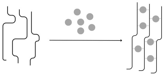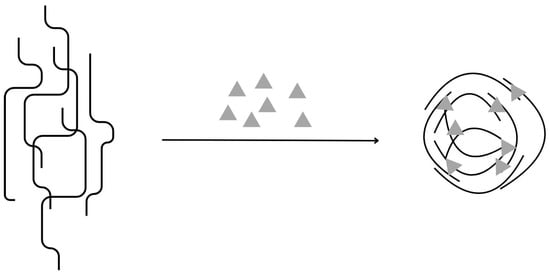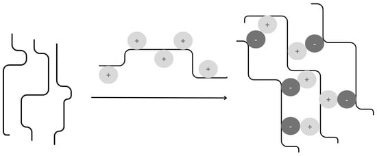This process is commonly used to produce microspheres and microcapsules. For example, the polyelectrolyte complex can be deposited at the interface between the oil droplets and the aqueous medium, forming microcapsules [51]. Gelling occurs through the interaction of two oppositely charged polymers (Figure 7) [64]. The negatively charged residues of one polymer interact with the positively charged residues of the second polymer [56]. Inter-complex aggregation is strongly dependent on the ratio of cationic to anionic groups. In the case of a non-stoichiometric ratio, the product is water soluble. The formation and subsequent behaviour of the polyelectrolyte complex are influenced by pH, electrolyte concentration, and the mixing order of the specific compounds [56].