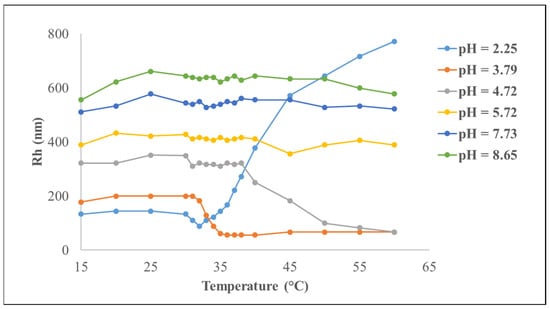 Plot of the hydrodynamic radius of poly (N-isopropylacrylamide-co-acrylic acid) polymer microgel according to the temperature at different pH values. Reproduced with permission from Farooqi et al., Arab. J. Chem.; published by Elsevier, 2017 [83].